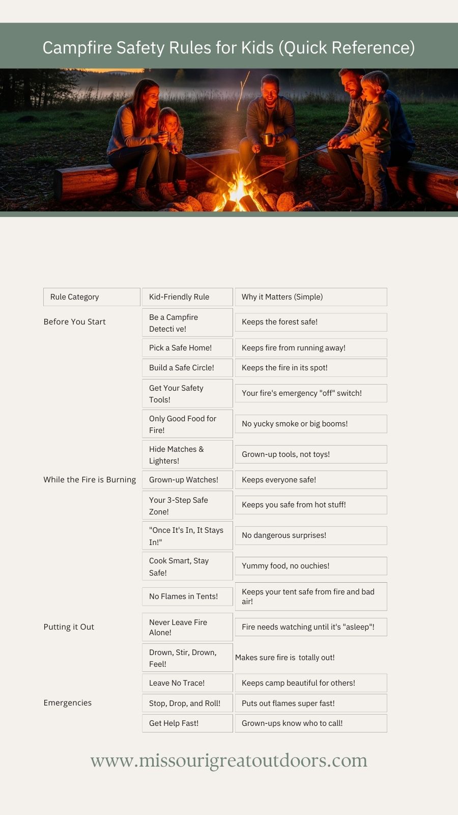 • Campfire Safety Rules (Quick Reference Guide) — Safety meets simplicity—nighttime should be fun and secure.