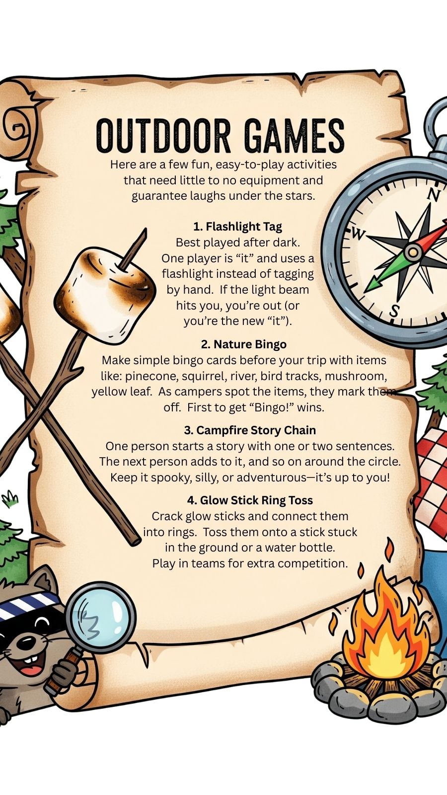 • Camping Scavenger Hunt — Pinecone, stick, bird feather—suddenly the forest doorway becomes a treasure trove.