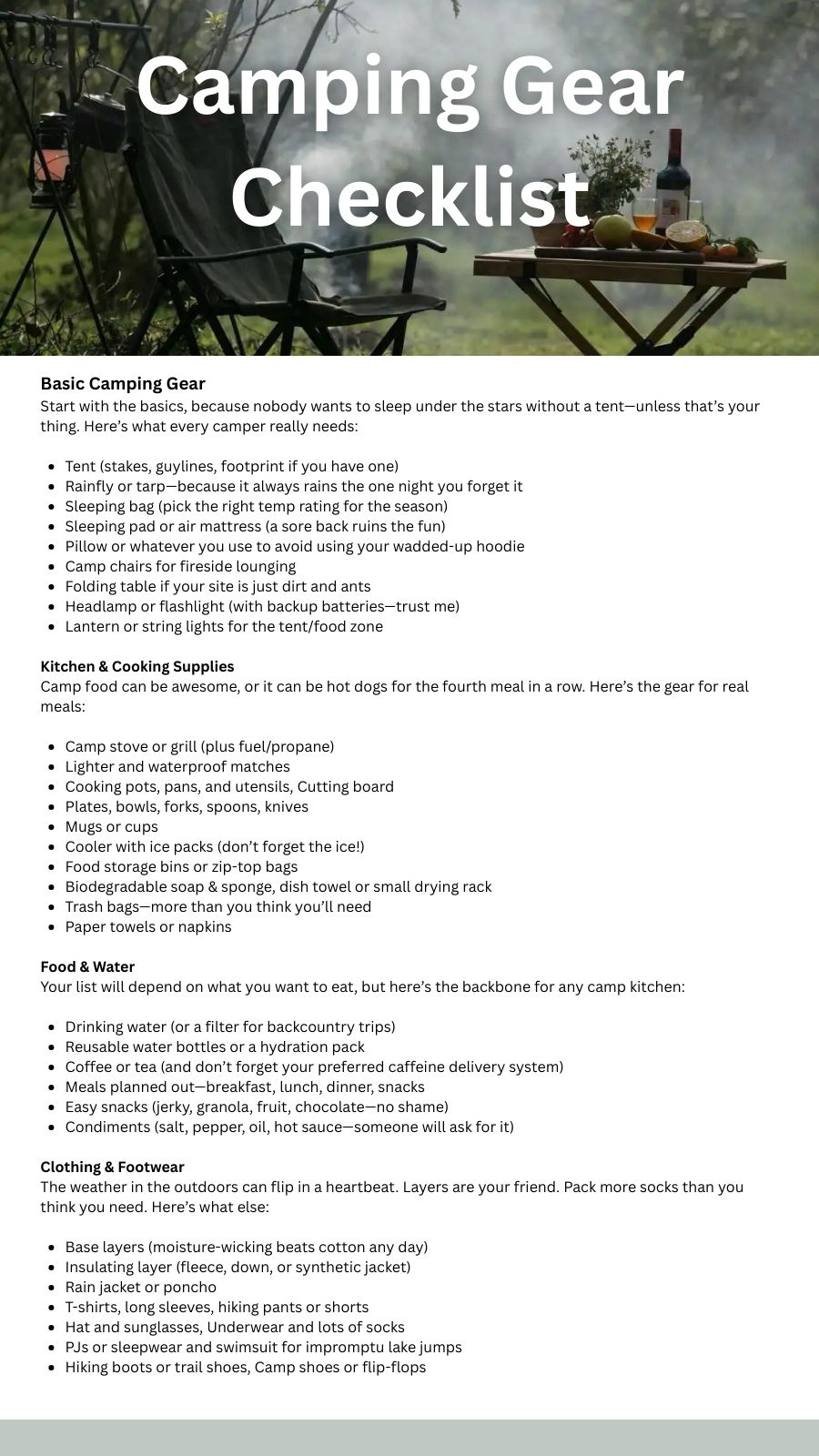 • Ultimate Camping Gear Checklist — No more “Did we forget to bring…?”—you’ve got a pro-grade list.