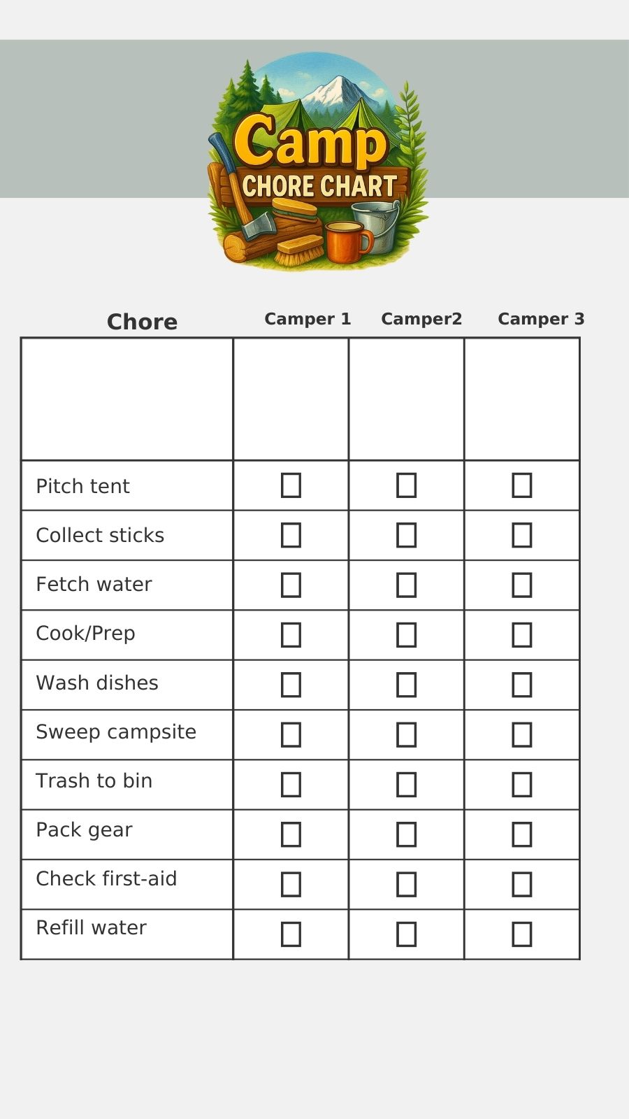 • Camp Chore Chart — Teach teamwork, earn brownie points (or literal brownies).